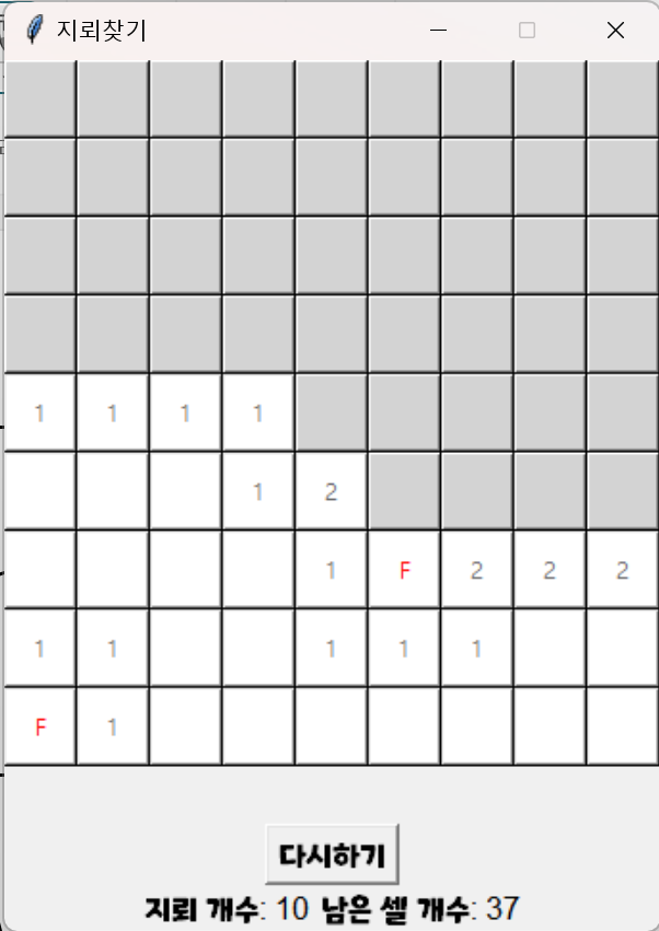 buttons[row][col].config(text='F', disabledforeground='red') #빨간색으로 변경