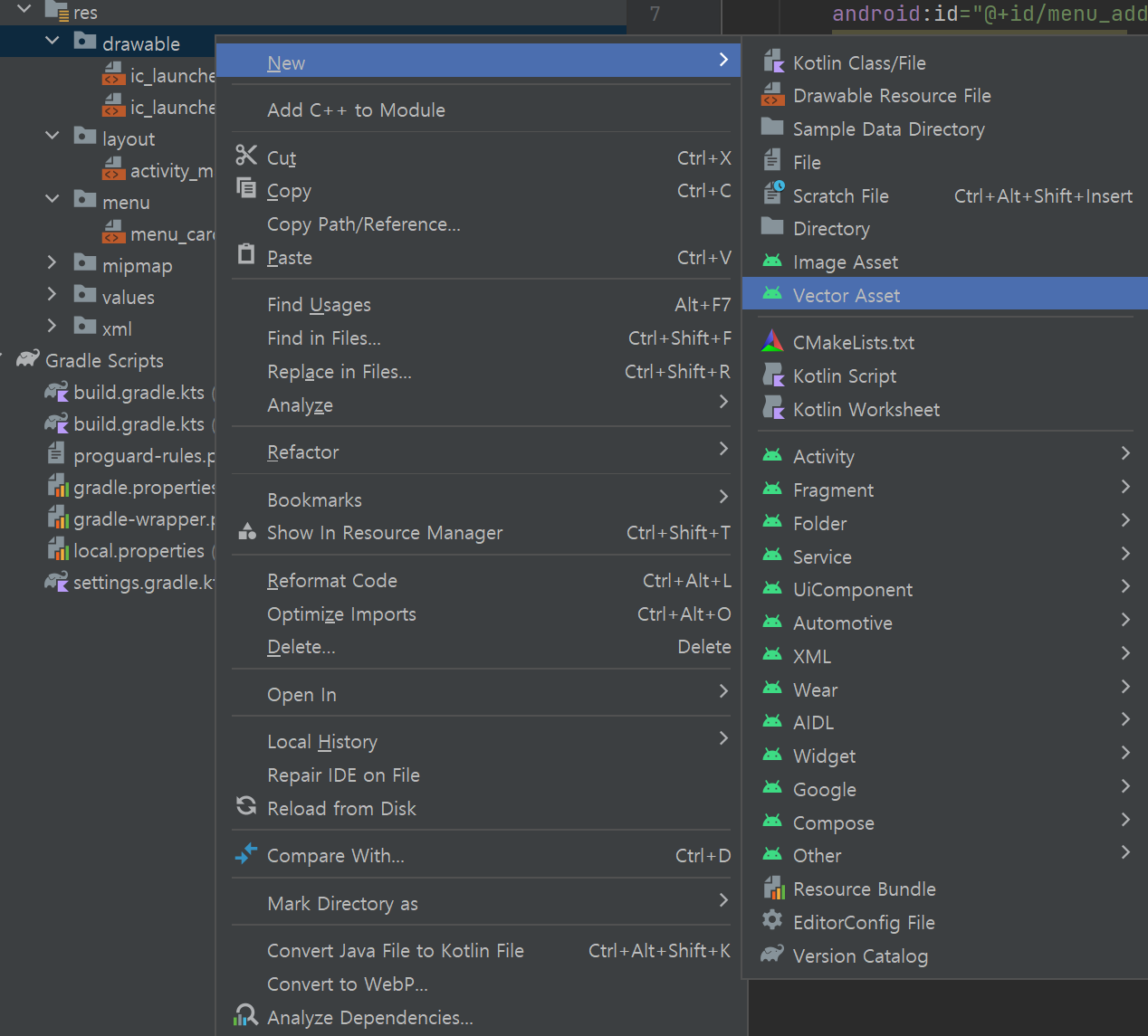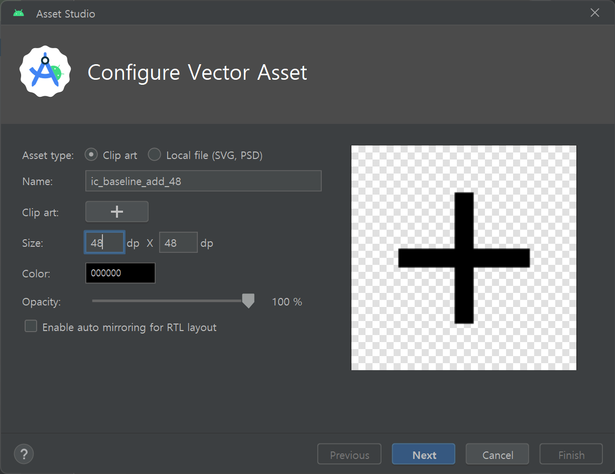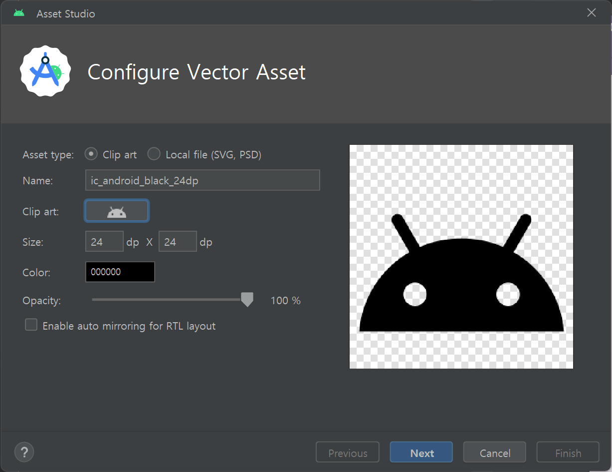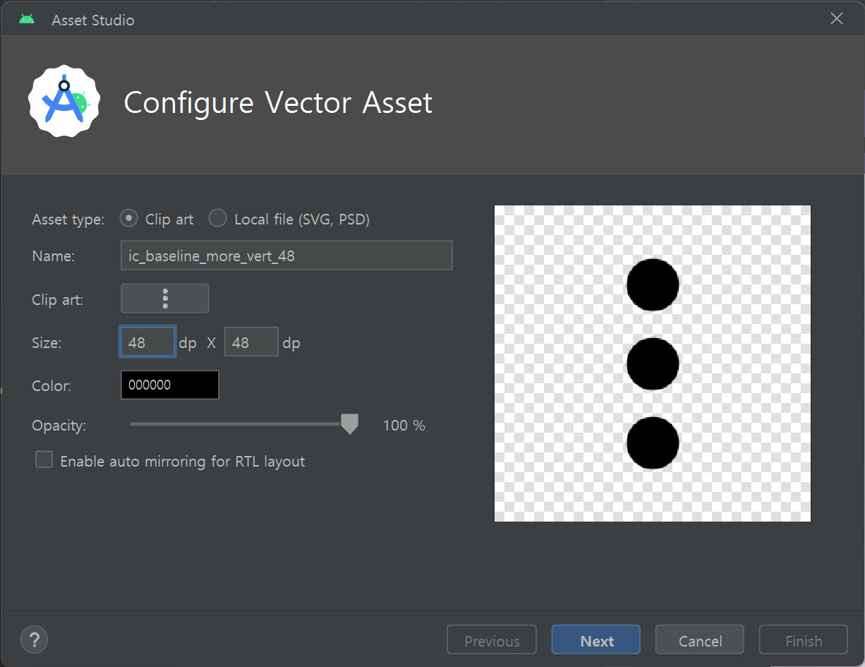 그럼 안드로이드에서 기본으로 제공하는 벡터 에셋이 나온다.