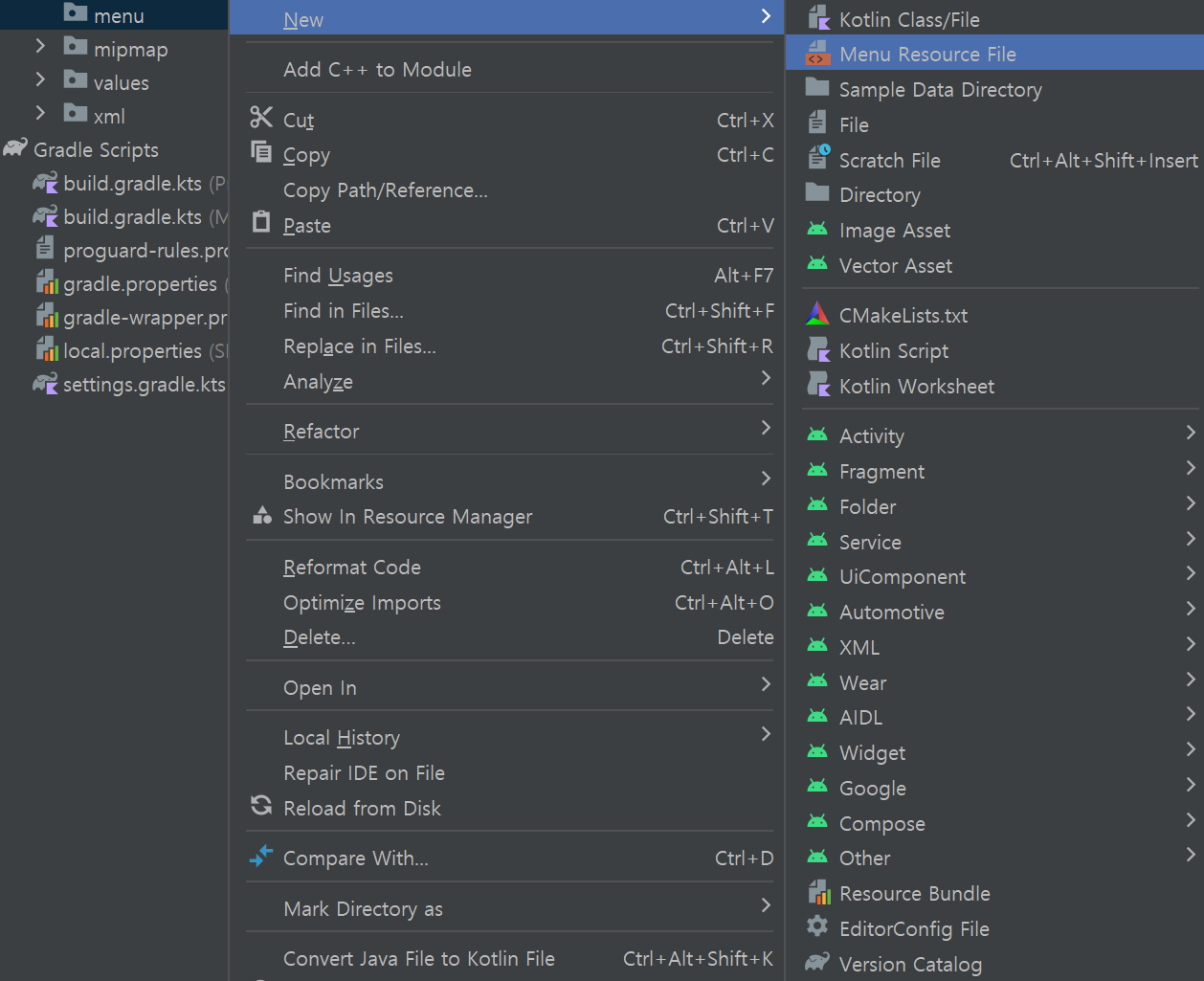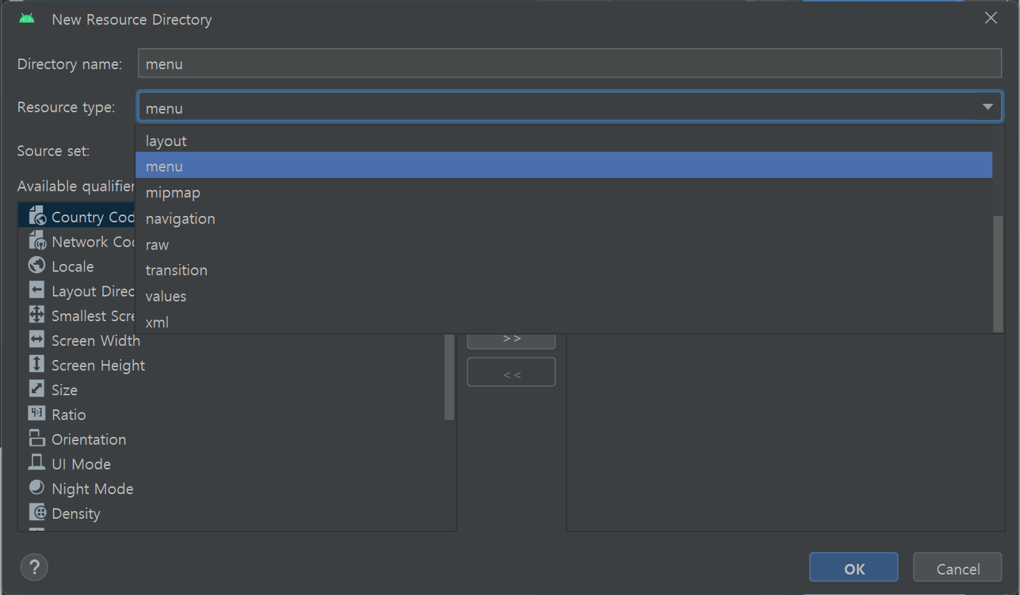 리소스 타입 중에 메뉴를 선택하고 OK를 누른다.
