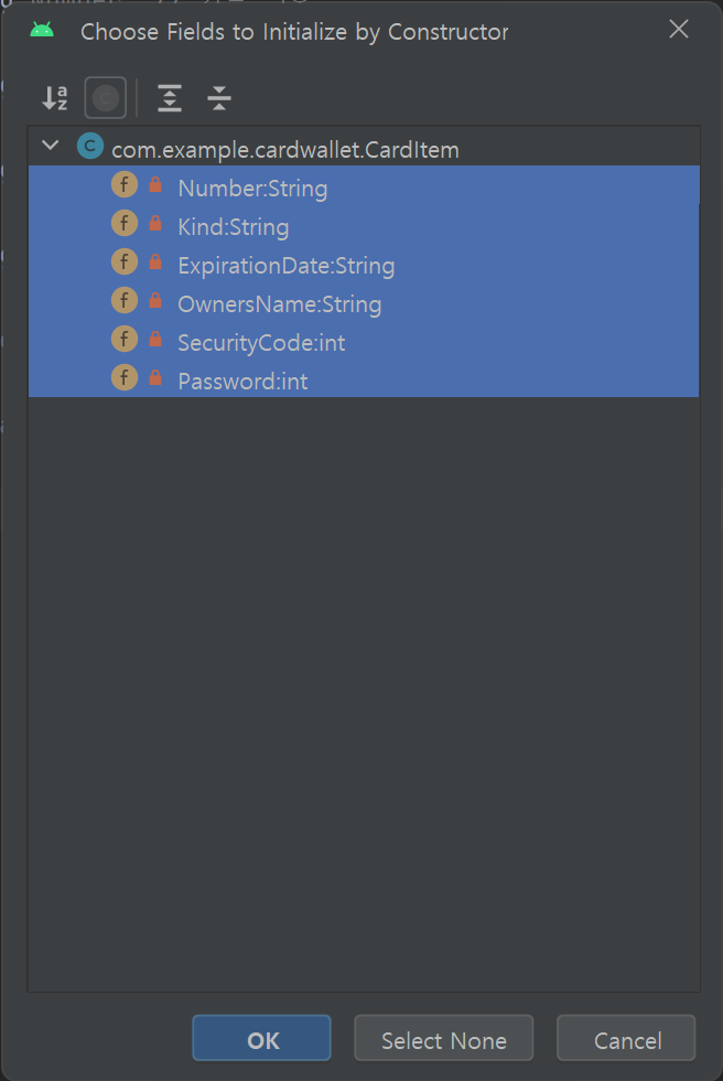 public CardItem(String number, String kind, String expirationDate, String ownersName, int securityCode, int password) {