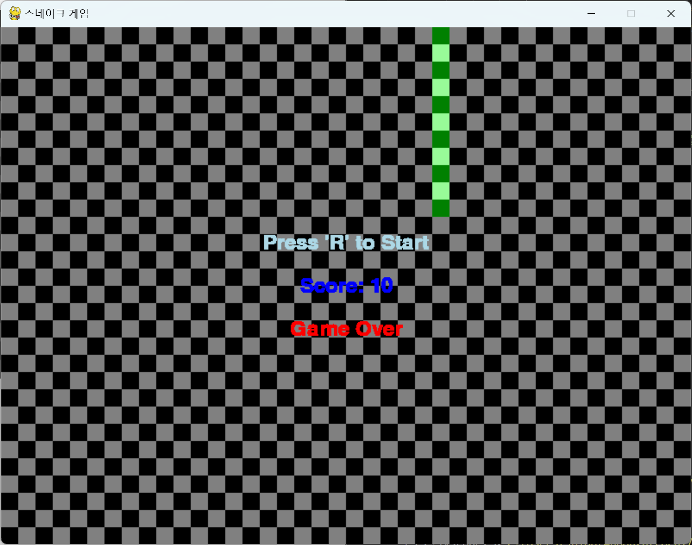# 게임 시작 상태일 때 화면에 "Game Over" 메시지와 사과를 먹은 개수 출력